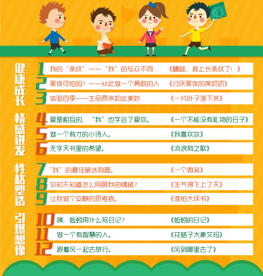 我们精选了12本经典绘本,12节课件讲授+12个主题任务,从身心健康、情感体验、性格塑造和想象迸发四个方面带给你不一样的阅读体验。