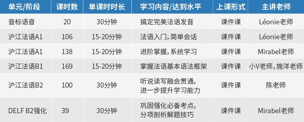 本课程采用由沪江法语教研团队结合国外原版教材和多年教学培训领域专业经验,精心研发的独家讲义,无需自备教材,上课前会通过电子讲义的方式免费提供。为方便学员,网校印制了纸质版(0-B2五册)的讲义,前50名报班可免费领取(大陆地区包邮送达)。