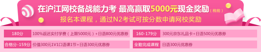 报名本课程并在班级统一有效期内参加日语能力考N2级别,通过考试即可按得分申请网校奖励。点击咨询详细规则>>