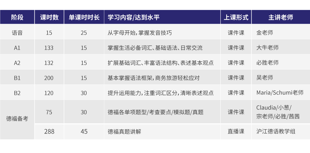 *语音及B2部分课程每讲约30分钟;A1、A2、B1部分课程每讲约15分钟。