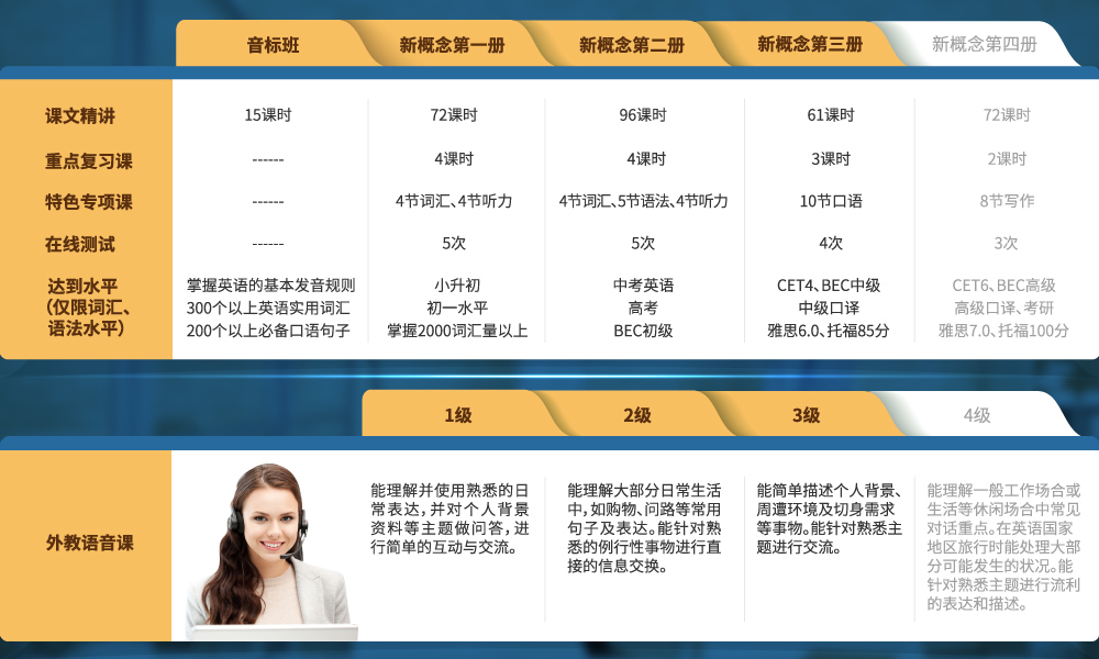 开课时间本班级课程一共包含音标班,新概念第1册,新概念第2册,新概念第3册以及30节外教语音课。