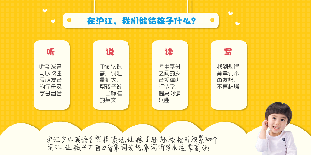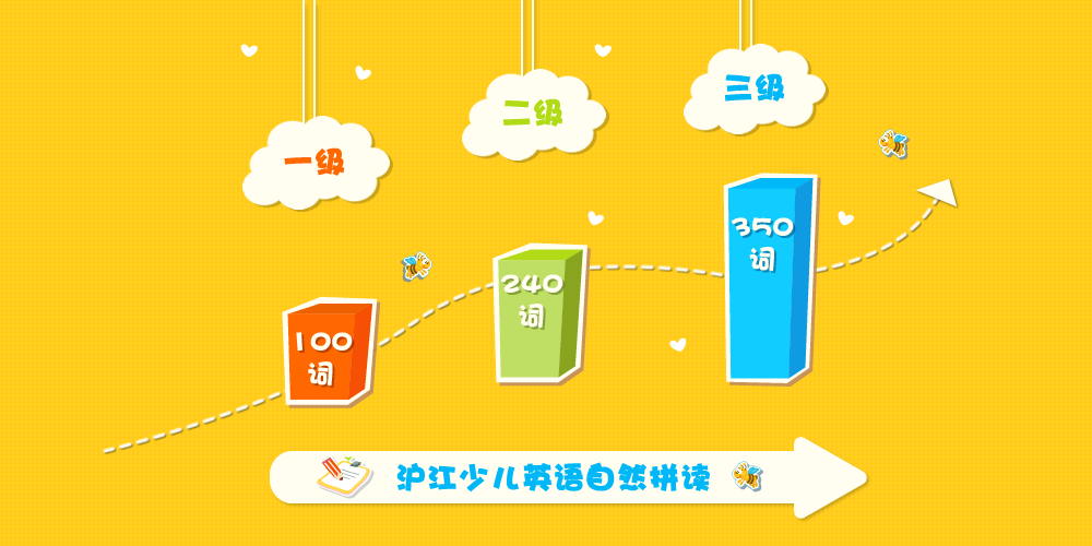 沪江少儿自然拼读系列课程,一共设有三个级别,专为幼少儿学员开设,通过26个英语字母的最常见发音和字母组合规律让小朋友在短期内达到:见词就能读,听音就能写的目标。学习完沪江少儿英语自然拼读3个级别,词汇量积累可以达到小学毕业水平。