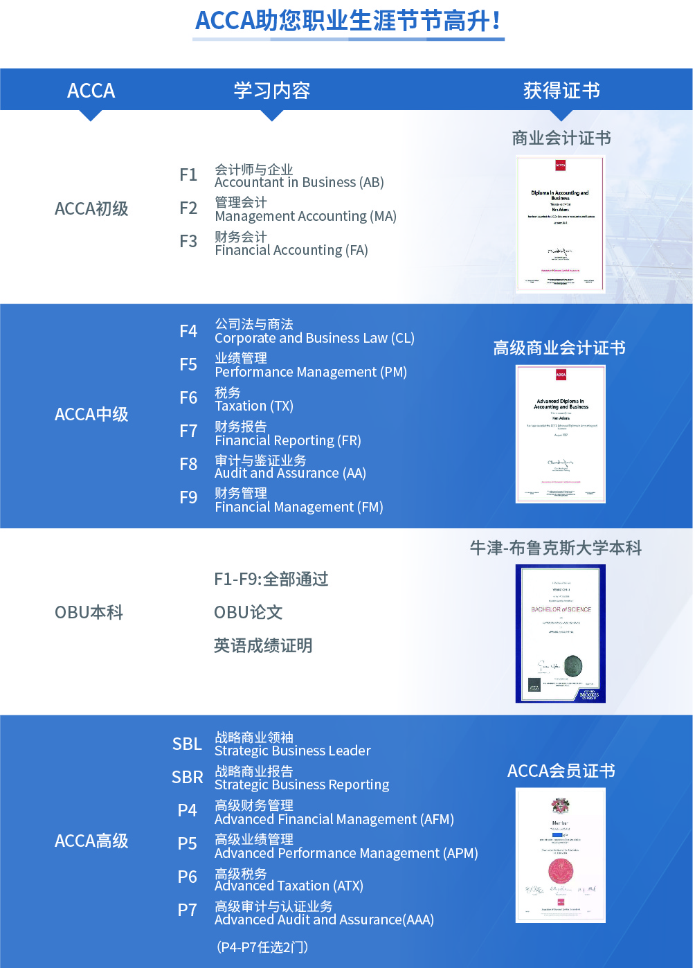 1. 顺利通过ACCA资格证书F+P阶段全部13门科目的考试;