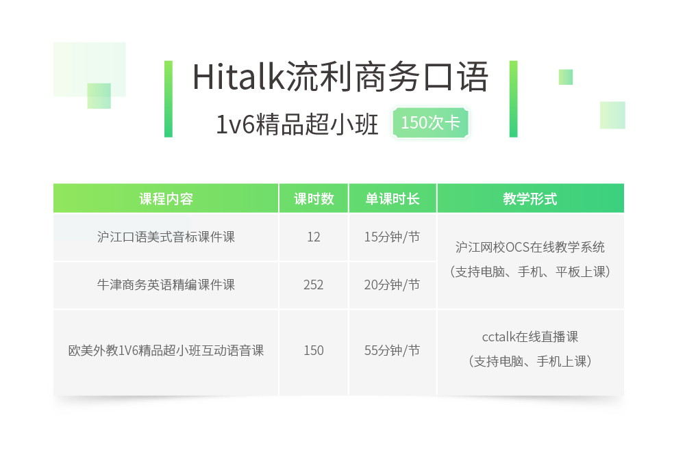 开课时间报名成功后,可在班级有效期内反复学习所有已发布完的精美课件课。可根据自己的时间自由预约欧美真人外教1V6精品超小班直播课。直播课每节课55分钟,每天多个上课时间段选择,可自由选择上课老师和时间段;支持提前一周预约。