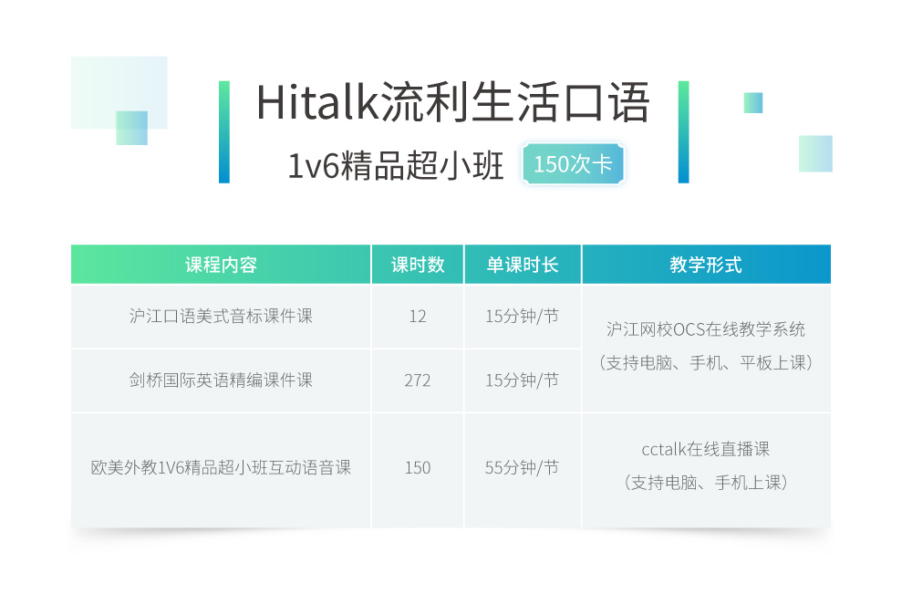 开课时间报名成功后,可在班级有效期内反复学习所有已发布完的精美课件课。可根据自己的时间自由预约欧美真人外教1V6精品超小班直播课。直播课每节课55分钟,每天多个上课时间段选择,可自由选择上课老师和时间段;支持提前一周预约。
