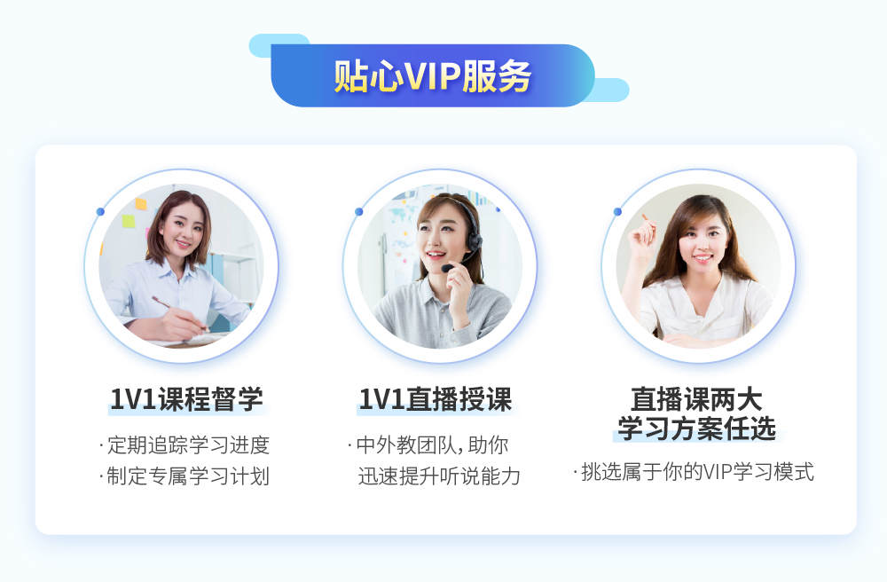 进班后,与专属督导沟通1V1口语直播课的学习方案(以上方案二选一),直播课预约与督导提前沟通确定即可。