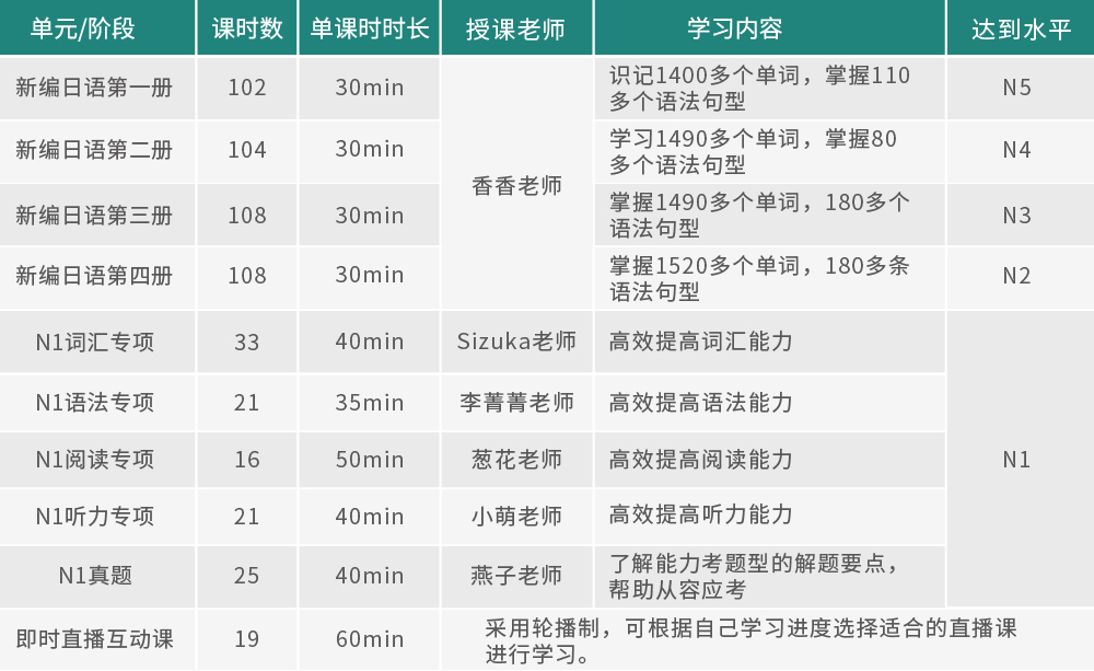 2.掌握8000-10000单词,800条语法,能够熟练使用日语,具备N1应试技巧,顺利通过N1级别考试;