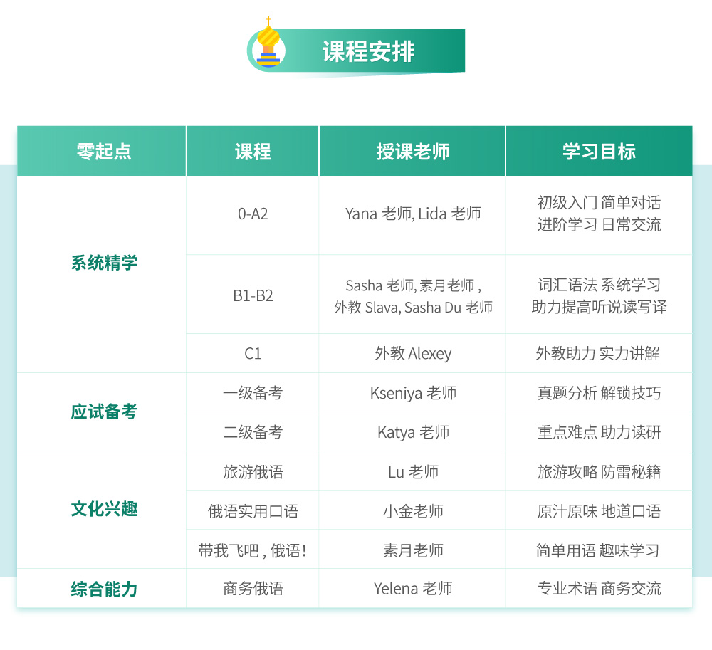开课时间课程开班后将一次性发布0-C1欧标课程、旅游俄语、俄语实用口语和带我飞吧,俄语;
