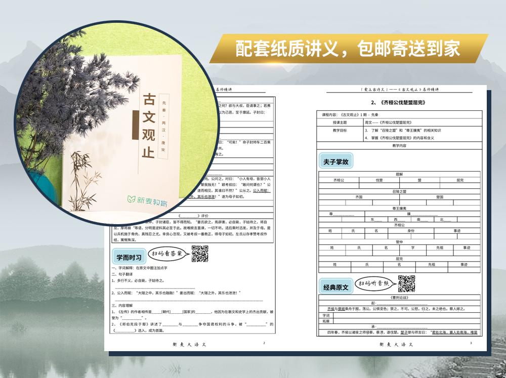 本套『古文观止』课程前三阶段核心内容【先秦】【两汉】【唐宋】,配套有一本纸质讲义,学员进班后可申领,包邮寄送到家!