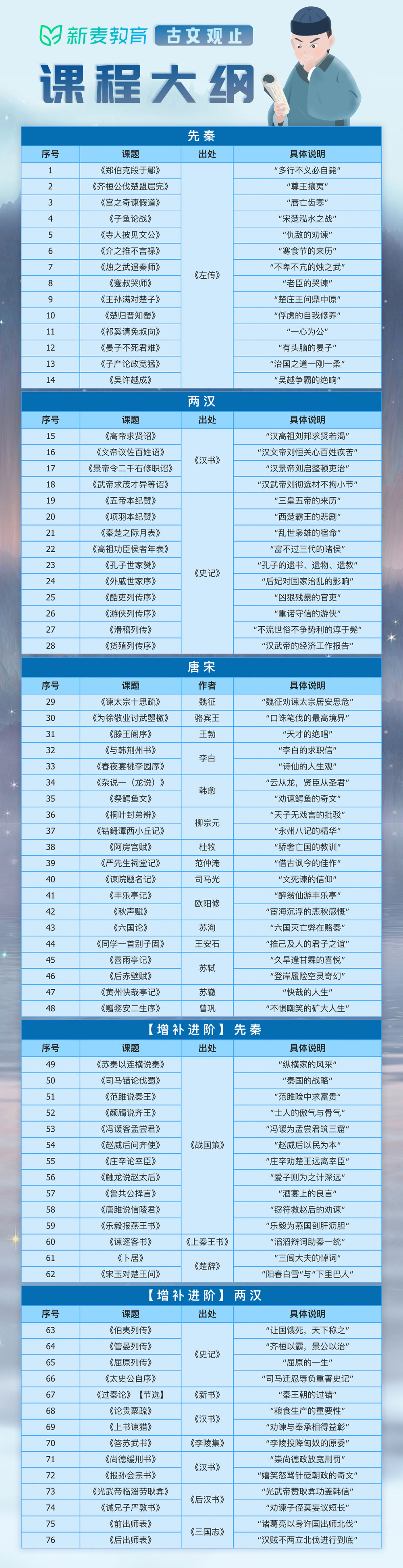 本套『古文观止』课程——“撮其要,选其精”,从《古文观止》12卷222篇的浩繁巨著中提炼出76篇,以年代顺序划分为三期内容——先秦、两汉、唐宋。
