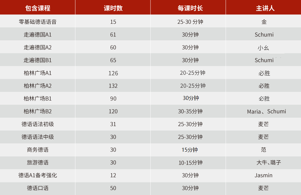 德语语法初级 31课时; 德语语法进阶 30课时;商务德语 30课时;旅游德语 30课时;A1备考12课时;德语口语(初级+进阶)50课时。