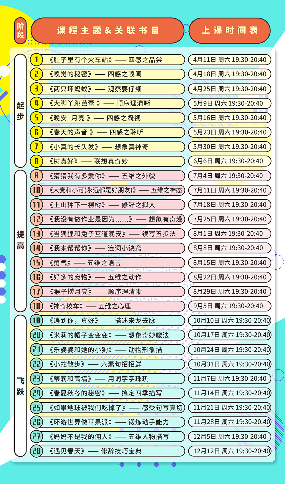 详细的课程大纲可参见下图所示,本课程设置了三个学习梯度:起步→提高→飞跃,每个梯度学习历时大约2个月的时间,在这大半年的学习中,我们将带着孩子们共读28本绘本,学习数十种写话技巧及方法,激发孩子们的写作兴趣与无限潜能!