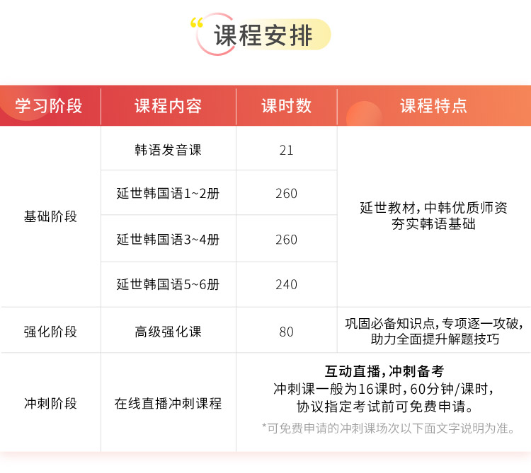 本班同学可免费申请2次直播冲刺备考课程:2022年10月韩语TOPIKⅡ(中高级)冲刺课程和2023年4月韩语TOPIKⅡ(中高级)冲刺课程。考试前2个月左右,该冲刺班上线,班主任会在班级发布免费申请帖,按照要求回帖申请即可。