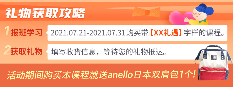 2021.7.21-2021.7.31期间内,凡购买本课程即【日语礼遇】日语零基础直达N2签约班,即赠送anello日本双肩包一个。