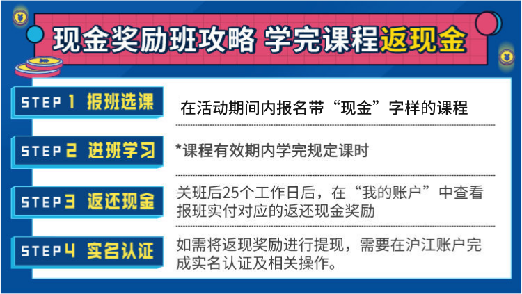 报名本现金奖励班的用户,在班级有效期内(指统一关班前,不包含请假/延期),主修课件课学完率达到100%,即可得到报名时实付金额25%的返现(实付金额需扣除学习卡、优惠券、折扣、订单立减等优惠,在统一关班后的2个月内发放)。如需将返现奖励进行提现,需要在沪江账户完成实名认证及相关操作。点击这里进行实名认证(APP用户请点击我的>我的账户>去实名)。