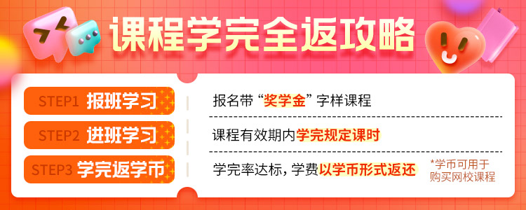 报名该奖学金班的学员,在统一关班前(如遇请假/延期,仍按统一关班时间考量),课件课学完率达到100%,并且直播课学完率达到80%,即可在关班后15个工作日内,返还报名时与实付金额等额的奖励学币(学币不可提现,可用于购买网校课程)。返还的奖励学币金额为扣除学习卡、优惠券、折扣、奖励学币等优惠后的最终实付金额(预先支付的定金及其他方式支付的金额均为实付金额)。
