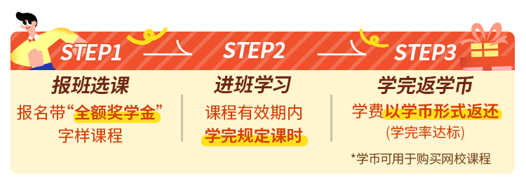 报名该奖学金班的学员,在统一关班前(如遇请假/延期,仍按统一关班时间考量),课件课学完率达到100%,并且直播课学完率达到80%,即可在关班后15个工作日内,返还报名时与实付金额等额的奖励学币(学币不可提现,可用于购买网校课程)。返还的奖励学币金额为扣除学习卡、优惠券、折扣、奖励学币等优惠后的最终实付金额(预先支付的定金及其他方式支付的金额均为实付金额)。