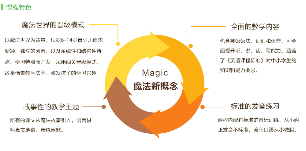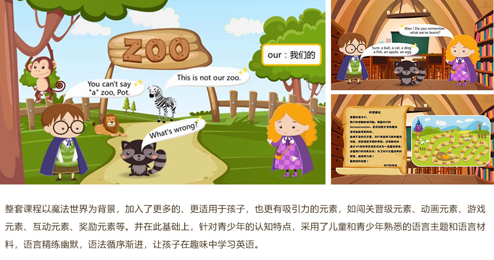 整套课程以魔法世界为背景,加入了更多的、更适用于孩子,也更有吸引力的元素,如闯关晋级元素、动画元素、游戏元素、互动元素、奖励元素等。并在此基础上,针对青少年的认知特点,采用了儿童和青少年熟悉的语言主题和语言材料,语言精练幽默,语法循序渐进,让孩子在趣味中慢慢学习英语。